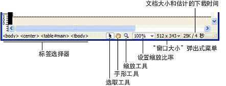標(biāo)簽選擇器顯示環(huán)繞當(dāng)前選定內(nèi)容的標(biāo)簽的層次結(jié)構(gòu)。單擊該層次結(jié)構(gòu)中的任何標(biāo)簽以選擇該標(biāo)簽及其全部?jī)?nèi)容。單擊 可以選擇文檔的整個(gè)正文。若要設(shè)置標(biāo)簽選擇器中某個(gè)標(biāo)簽的 class 或 id 屬性,請(qǐng)右鍵單擊 (Windows) 或按住 Control 鍵并單擊 (Macintosh) 該標(biāo)簽,然后從上下文菜單中選擇一個(gè)類或 ID。標(biāo)簽選擇器是選擇標(biāo)簽的首選方法,因?yàn)樗梢源_保您始終準(zhǔn)確地選擇標(biāo)簽。手形工具使您可以單擊文檔并將其拖入"文檔"窗口。單擊"選擇"工具可禁用手形工具。"縮放"工具和"設(shè)置縮放比率"彈出式菜單可以讓您為文檔設(shè)置縮放比率。"窗口大小"彈出式菜單(僅在"設(shè)計(jì)"視圖中可見(jiàn))用來(lái)將"文檔"窗口的大小調(diào)整到預(yù)定義或自定義的尺寸。"窗口大出式菜單的右側(cè)是頁(yè)面(包括全部相關(guān)的文件,如圖像和其它媒體文件)的文檔大小和估計(jì)下載時(shí)間。