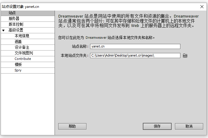 最后你在dreamweaver主界面可以看到出現了本地的站點。這證明你的站點建立完成。你以后的網站文件都會存儲在你的這個文件夾下。如圖: